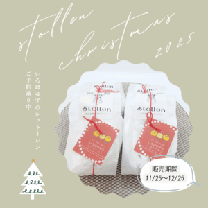 毎年好評のシュトーレンです。 上河内特産のいろはゆずがほんのり香る上品で香ばしいシュトーレンです。